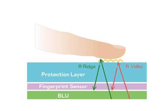 TFT 指纹扫描感测技术利用薄膜电晶体 (TFT) 当作光感测元件,,,,藉由非晶硅 (a-Si) 与低温多晶硅(LTPS)既有光电转换特性对不同波段光源进行吸收,,,,使感测 IC 读取阵列感测元件的光漏电差异,,转换成数位灰阶影像。。。